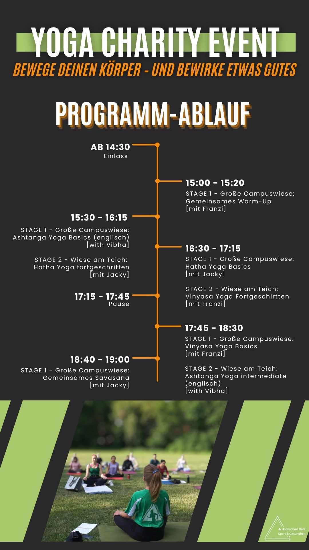 Am 08.05.2026 laden wir Dich zu unserem Yoga-Charity Event ein! Und das Beste: Alle Einnahmen gehen direkt als Spende an den Verein für Krebskranke Kinder e.V.! Sei dabei, wenn wir auf der Campuswiese in Wernigerode die Vielfalt des Yogas erleben und gemeinsam mit unseren Kursleiterinnen Hatha-, Vinyasa- und Ashtanga-Yoga ausprobieren. Genieße einen Nachmittag voller Kraft, Entspannung und Achtsamkeit. Daneben kannst Du dich mit dem Verein für Krebskranke Kinder e.V. austauschen und kleine Snacks sowie Getränke zu genießen.